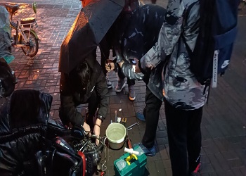活动当天虽然下着小雨,修车队员们仍早早的带着工具箱来到了修车地点,拉好修车条幅随即开始了修车活动。因为天气原因,修车过程变得异常艰难,在拆卸和安装内胎的过程中遇到了很大的困难,被雨打湿的内胎在打磨时变得异常艰难,胶水粘了又粘,锉刀磨了又磨,最终在队员们的配合下成功将胎补好。最后,志愿者们为前来寻求帮助的同学更换电动车前轮的内胎,看着被修车队员修补过的内胎光荣退休,队员们的心里得到了极大的满足。修补过程中队员们分工明确,相互配合,将车胎换成新车胎。看到寻求帮助的同学将修好的车子骑走,志愿者们忘记了劳累,露出了笑容。