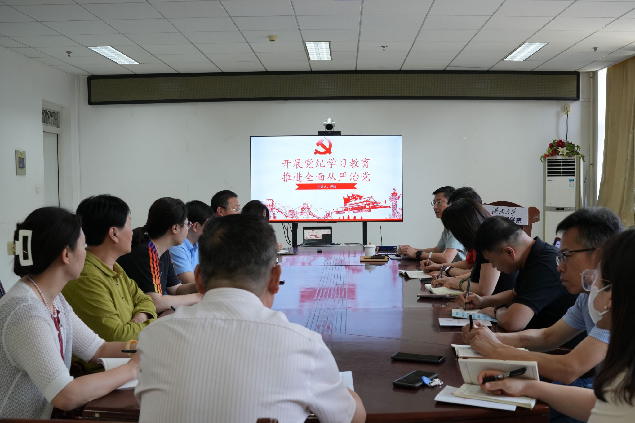 程涛以“开展党纪学习教育,推进全面从严治党”为主题开展专题党课,围绕全面从严治党的理论要点、现实挑战、行动纲领展开学习。通过生动的案例分析和深入的理论探讨,使党员对全面从严治党发展历程有了更加全面和深入的了解,引导党员以案为鉴、以案促改、以案促治。大家纷纷表示,要持续强化一如既往的政治要求、一以贯之的政治定力、一抓到底的政治担当,坚持严的主基调不动摇,坚持不懈把全面从严治党向纵深推进,推动党纪学习教育的成果转化为风清气正的育人环境。