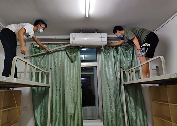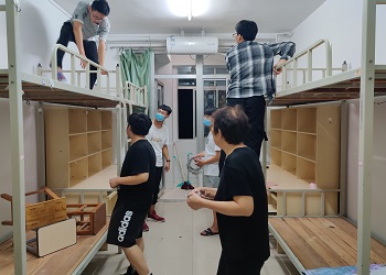 学生会各部门成员分为3个小组,分别在宿舍楼的4、5、6楼宿舍展开检查工作。对每层楼的每一间宿舍的床铺、地面、桌子及书架、阳台、卫生间的情况进行了检查,保证宿舍的水电能够正常使用,同时,为床铺贴上新的床标,将原来旧的窗帘换成新的窗帘,核对每间宿舍的锁是否匹配,并简单的对宿舍的通风情况进行检查,将未开窗通风的宿舍打开窗户,拉上窗纱。在此工作期间,各部门成员认真地检查每间宿舍的各项情况,对于需要报修的宿舍及时记录并尽快向学校反映,为新生提供一个良好的住宿条件。